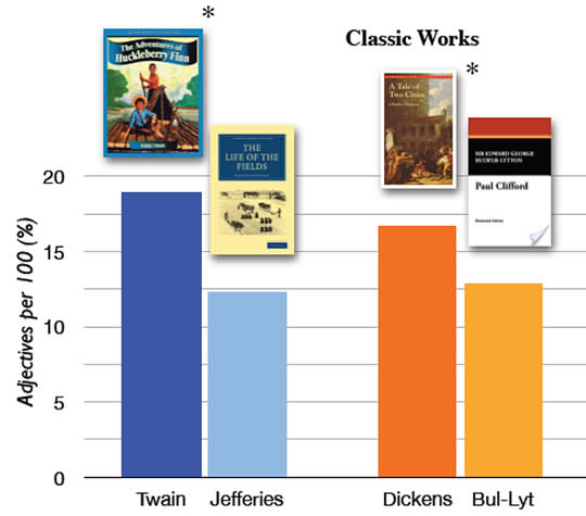 The Purdue researchers contrasted the use in adjectives by successful and less successful authors, both in classics and modern books. For the classics, they counted the adjectives in the first hundred words of forty different novels by Mark Twain, Charles Dickens, Richard Jefferies, and Edward Bulwer-Lytton. These authors were contemporaries, but the first two sold far more books.