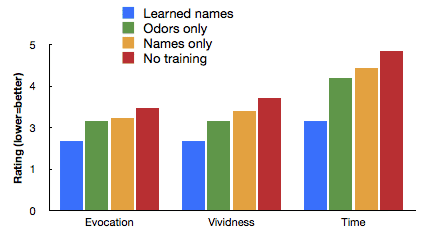 More interesting is that those individuals trained with both the scent and its name were better able to imagine the scent than any other group, as shown below (note that a shorter bar is better):