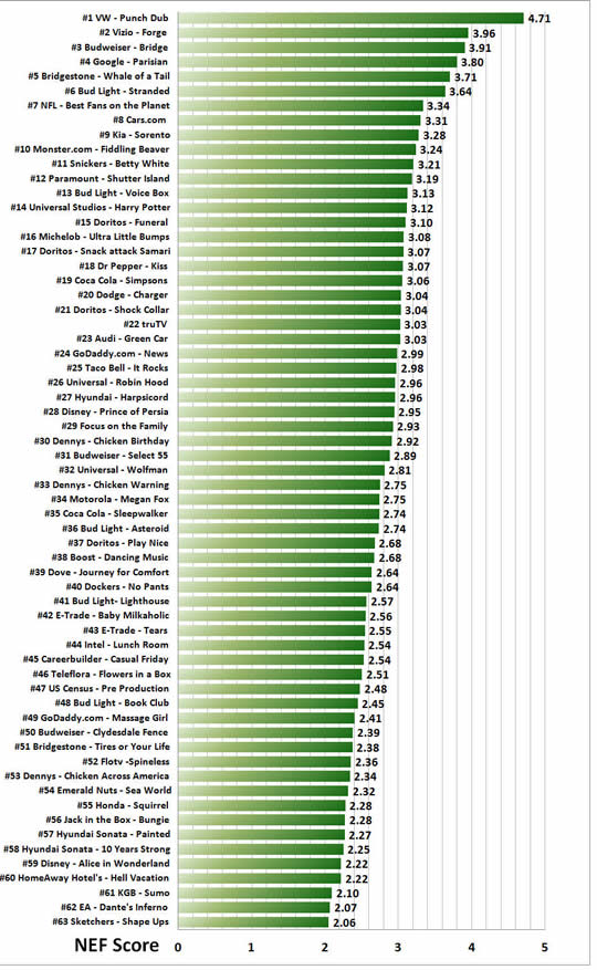 In what is becoming an annual event, Sands Research announced the “winning” commercials for Super Bowl 2010 as determined by their neuromarketing analysis. Volkswagen emerged as #1, well ahead of the competition by Sands’ metrics.